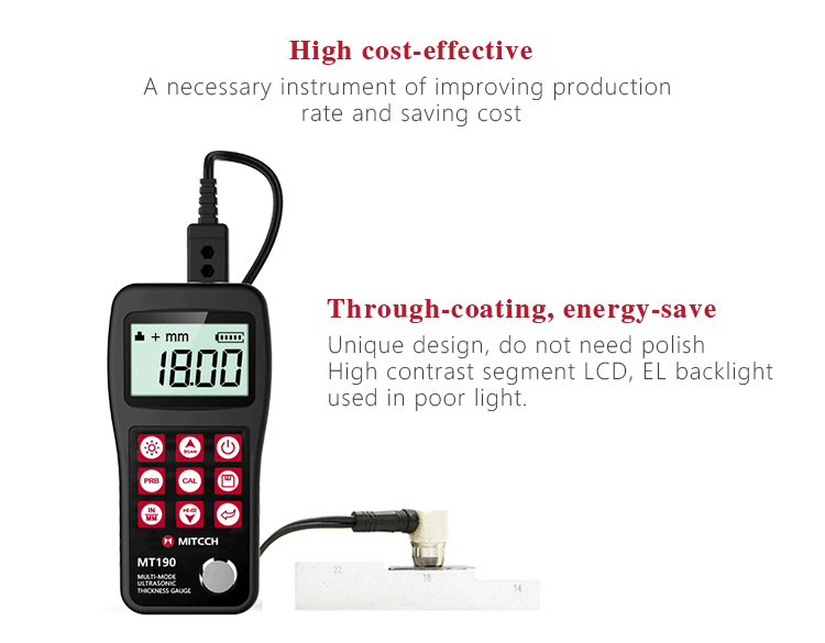 Product OverviewMiteh MT190 multi-mode ultrasonic thickness gauge, based on ultrasonic measuring principle, it can perform thickness measurements on a wide range of materials including metals, plastic, ceramics glass and other ultrasonic well-conductive materials. It is also capable for measuring the sound velocity of the object with known thickness. Compared with the traditional measurement method, the advantage of ultrasonic thickness gauge is that it can finish the measurement only if it contacts with one side of the measured workpiece. Its unique performance of capable for testing thickness through the coating provides efficient solution for testing the workpiece of coated surface or corrosion materials. It can test the workpiece directly without needing to get rid of the surface coating. It’s widely used for monitoring the production equipments’ various pipelines and pressure vessel corrosion reducing degree in the fields of petroleum, chemical, metallurgy, shipbuilding, aviation, aerospace and so on. It also can be used for making accurate measurement to various plates and machining parts. It is the necessary professional precision instrument for improving the production efficiency and qualification rate as well as saving cost.
