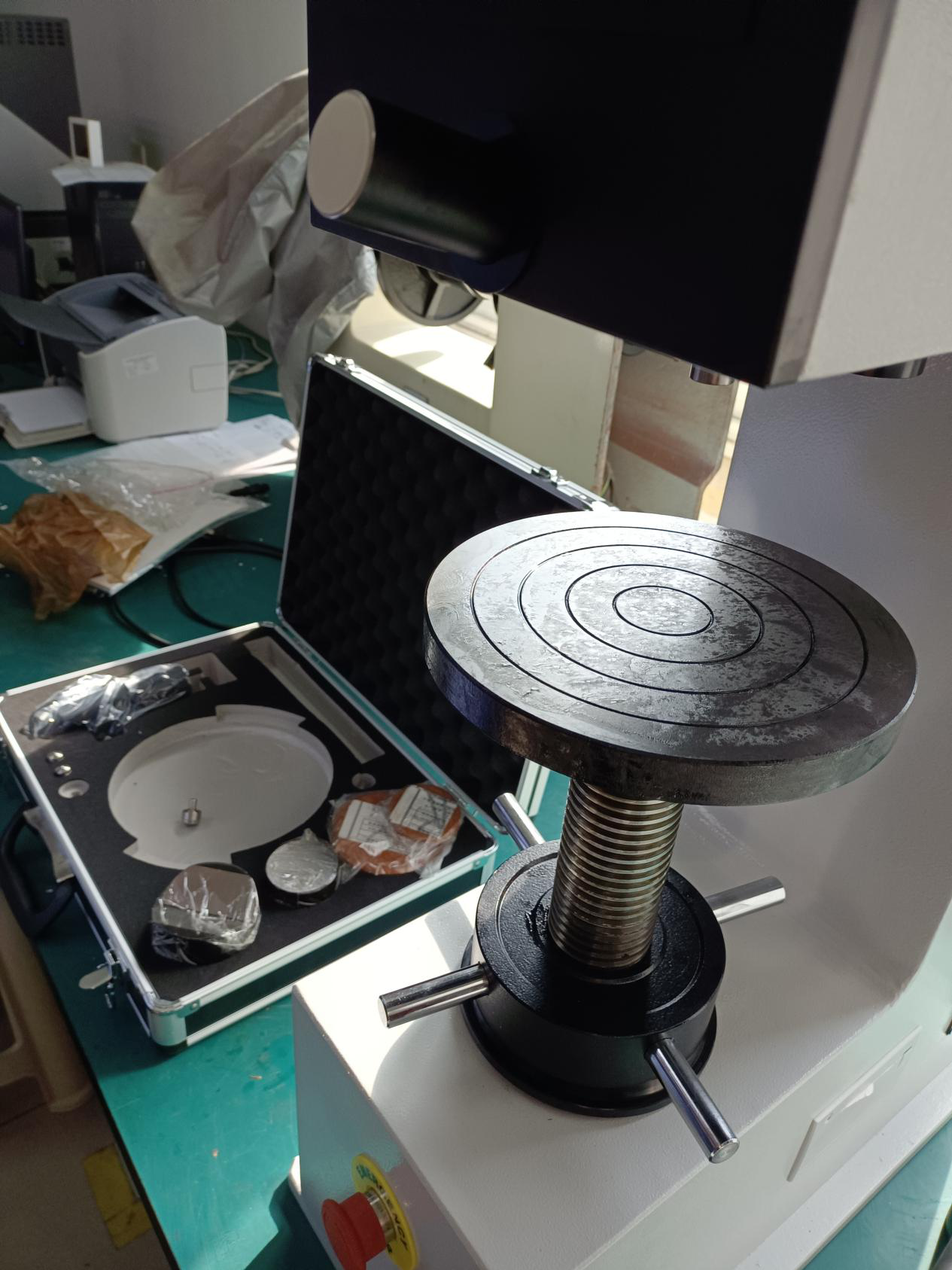 美泰MHBS-3000Z配備了三個測量載臺以適配不同大小、不同形狀工件的測量。工程師詳細講解了如何對儀器進行校零,測量以及打印。首先把工件放在平臺上,通過手動旋轉把工件提高到最接近壓頭的位置。點擊啟動按鈕,儀器會自動運行加荷,保荷和卸荷,卸荷完成后,塔臺自動轉動,將測量物鏡轉到待測壓痕正上方,通過測量目鏡測量出壓痕直徑,D1\D2,點擊測量按鈕,儀器自動測量出被測工件的布氏硬度,并自動轉化出所對應的洛氏、維氏等硬度值。
