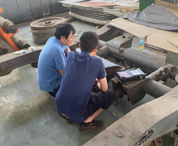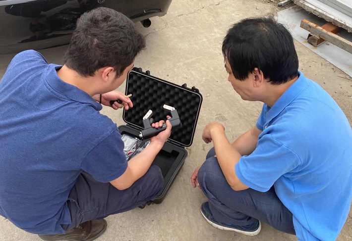 在車間,教授為我們講解了高鐵車廂的結構構成,和工件的整體結構構成及工作承重環境。了解了工件的大體結構后,美泰工程師首先使用美泰超聲波測厚儀和涂層測厚儀對工件板材、管件厚度及表面涂層厚度基本參數進行測量,而后使用美泰超聲波探傷儀對待檢焊縫進行實地探傷試驗。