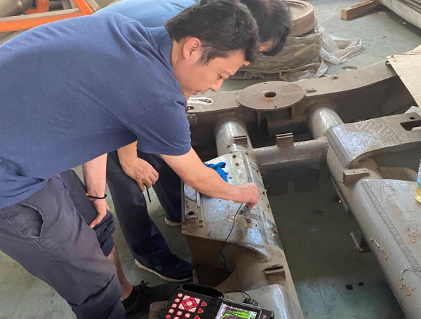 2020年8月26日,北京美泰科儀協同北京某大學教授一起來到北京某地鐵運營公司進行現場探傷試驗,為地鐵的無損檢測工作設計實施方案。目前在役地鐵要求每滿5年進行一次全面維檢,主要檢測部件是地鐵轉向架等關鍵部件,檢測部位有轉向架與電機、減速箱連接處板材的焊縫等。現有檢測手段是將相關配件從裝向架上拆除后,對轉向架進行脫漆處理,然后用磁粉探傷儀對焊縫進行探傷。由于當前檢測手段只能對焊縫表面進行檢測,特邀請美泰技術工程師協助現場演示并探討超聲波探傷儀對焊縫檢測的具體方案。