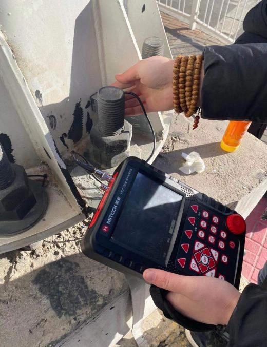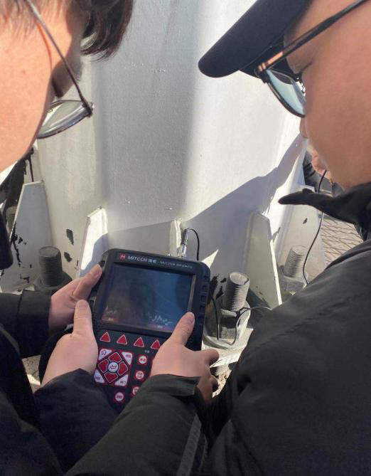美泰工程師先使用超聲波探傷儀進行內部缺陷檢測,當天現場溫度較低,達到零下17℃,事先準備的耦合劑洗滌精,在使用過程中,短短幾秒就被凍結,現場人員又購買了食用油用作耦合。雖然現場溫度較低,但是在更換耦合劑之后,檢測效果別沒有受到影響,儀器波形顯示靈敏且清晰。現場檢測效果十分理想,美泰科儀高智能超聲波探傷儀MUT550B在北方極冷惡劣情況下無任何不良反應。