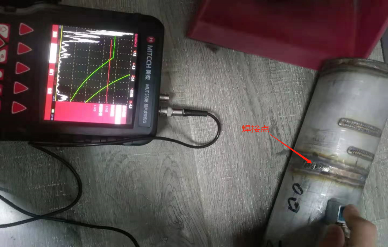 現場了解到,待測工件為4-8mm的管道焊縫,焊接工藝采用的是不銹鋼焊絲焊的氣體保護焊,主要是對接焊和角焊,現場目視焊縫焊接基本美觀平整。根據實際情況,美泰工程師選用2.5p 9*9 k3的單晶斜探頭進行檢測,對接焊處焊接點可以觀察到明顯的缺陷波。對接焊接管道處進行全面掃查探傷后,焊接點缺陷明顯,角焊處角落有小氣泡的存在。