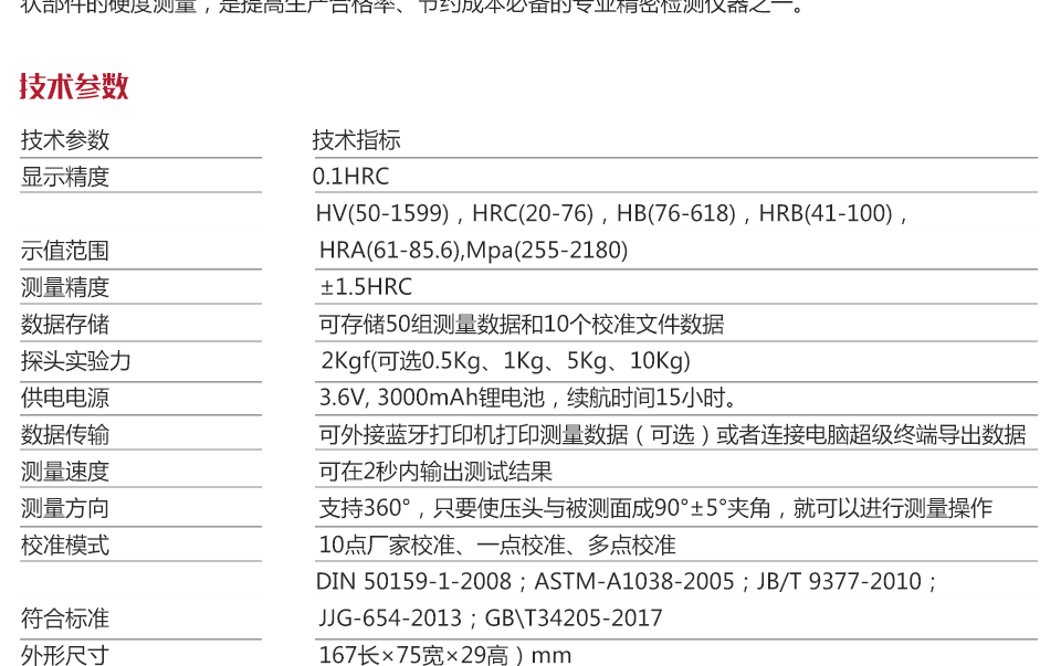 | 測量方向 | 支持360°,只要使壓頭與被測面成90°±5°夾角,就可以進行測量操作 |