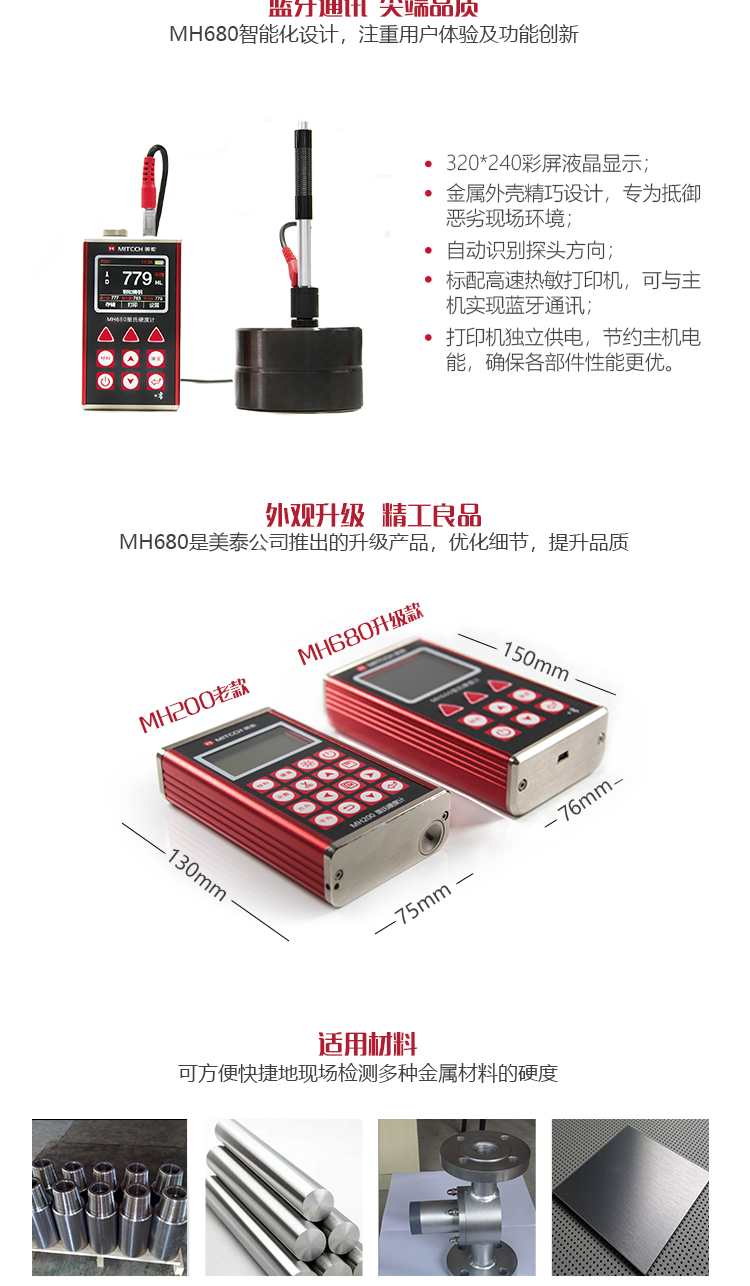 產(chǎn)品概述MH680便攜式里氏硬度計(jì)是定制化在線硬度檢測系統(tǒng)的配套產(chǎn)品,它可實(shí)現(xiàn)藍(lán)牙無線傳輸數(shù)據(jù),將自動(dòng)化硬度檢測系統(tǒng)工作中采集的硬度值傳輸至電腦端,通過藍(lán)牙接口與儀器進(jìn)行通訊,實(shí)現(xiàn)在線實(shí)時(shí)監(jiān)測數(shù)據(jù),對超出范圍的不良品及時(shí)報(bào)警或自動(dòng)噴標(biāo)處理,針對檢測量大、效率要求高的用戶需求,可解放人力、提高生產(chǎn)效率,被廣泛應(yīng)用于量產(chǎn)較大的金屬加工制造業(yè),本公司可提供針對不同用戶需求的軟硬件定制化服務(wù)。