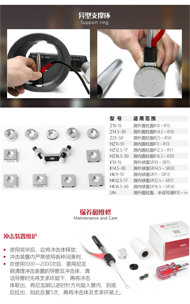 曲面工件:工件的試驗(yàn)面最好是平面。當(dāng)被測表面曲率半徑R小于30mm的工件在測試時(shí)應(yīng)使用小支承環(huán)或異型支承環(huán);