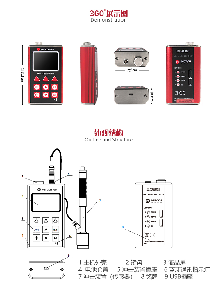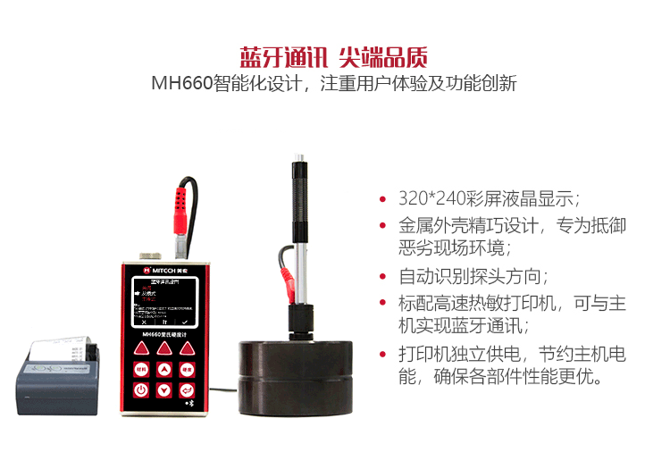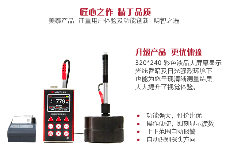 產品概述MH660便攜式里氏硬度計是美泰公司新推出的升級產品,它更加注重用戶體驗及功能創新。采用320×240彩色液晶顯示屏,光線昏暗及日光強烈環境下也能為您呈現清晰測量結果,大大提升了視覺體驗;密封的金屬外殼精巧設計,體積更小、品質更優,專為抵御惡劣現場環境中的油污、粉塵而設計;獨創的多點校準功能,可對轉換曲線進行多點調校,減小測量誤差;測量中儀器可自動識別測量方向,滿足高效采集多角度材料硬度的精準檢測需求,支持多種硬度制氏間的自由轉換;低功耗設計由兩節AA五號電池供電,可實現藍牙通訊,支持多語言版本切換。被廣泛地應用于金屬加工制造業、特種設備或永久性組件的在役失效分析、商檢等領域。特別適宜對大型不可拆卸部件的現場硬度測試。是提高生產合格率、節約成本必備的專業精密儀器。