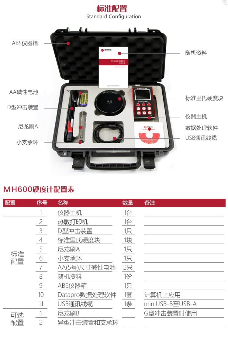 可存儲1000組(沖擊次數32~1)硬度測量數據,每組數據包括單次測量值、平均值、測量日期/時間、沖擊方向、次數、材料、硬度制等信息。