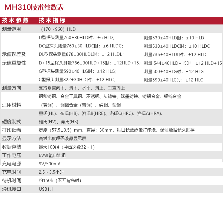 產品概述MH310便攜式里氏硬度計基于里氏硬度測量原理,可方便快捷地現場檢測多種金屬材料的硬度,支持里氏、布氏、洛氏等多種硬度制氏間的自由轉換。它采用高對比度段碼式液晶屏,顯示清晰,性能穩定,集成一體式高速熱敏打印機,可現場即時打印測量結果。被廣泛應用于退火、回火、淬火熱處理工件的質量控制;機床導軌、汽車底盤的硬度檢測;大型不可拆卸零部件的現場在役硬度測試;五金、鍛造、機床、特種鋼材的質量檢測;批量生產過程中產品的質量控制等,質優價廉,實用經濟,是硬度檢測常規需求的明智之選。