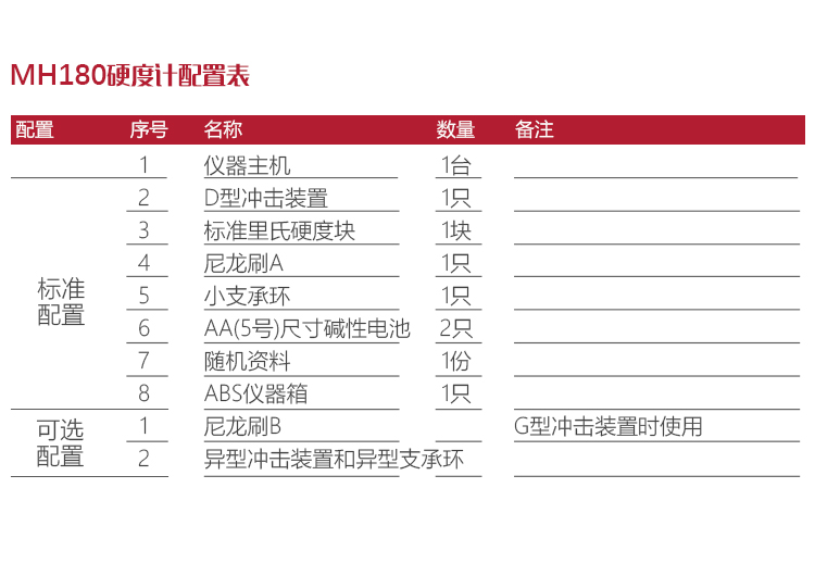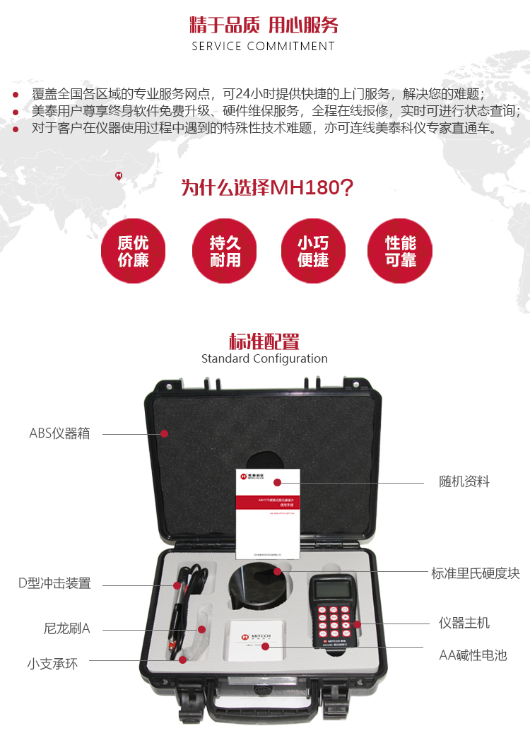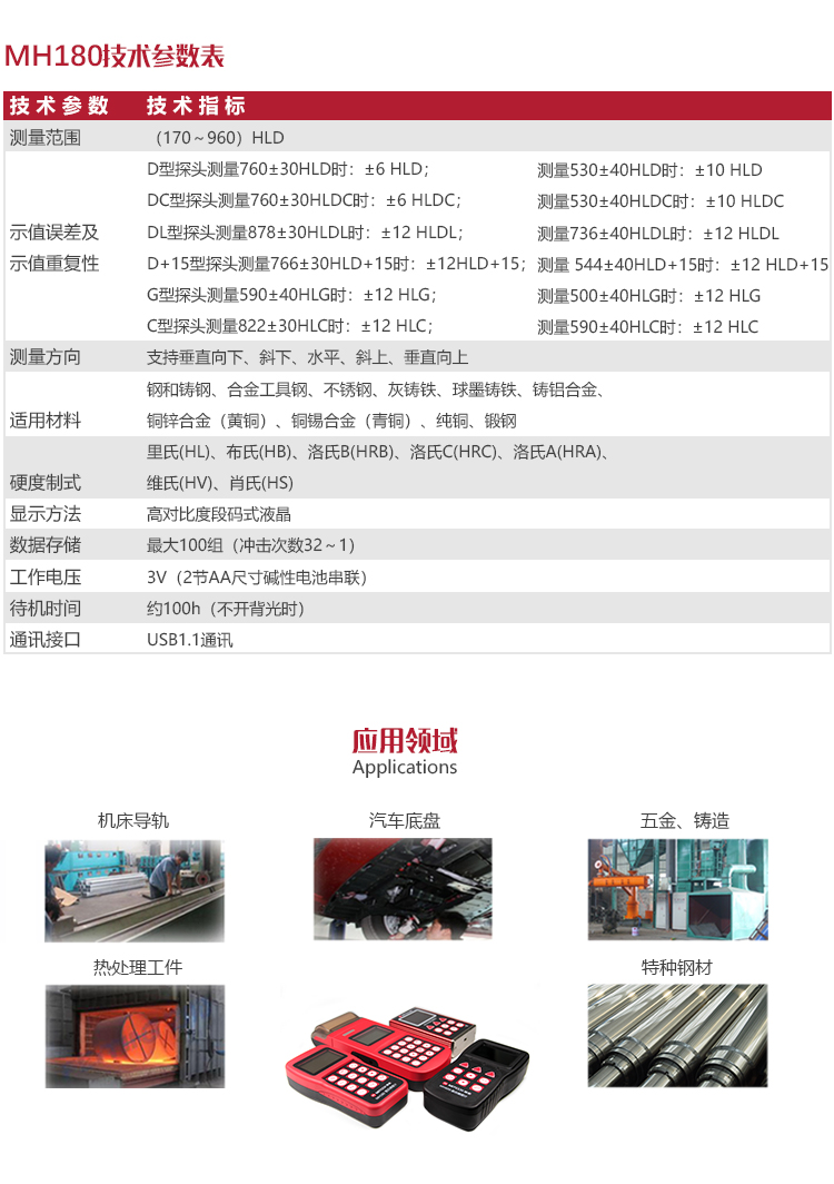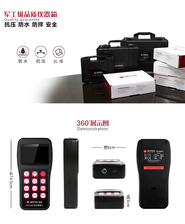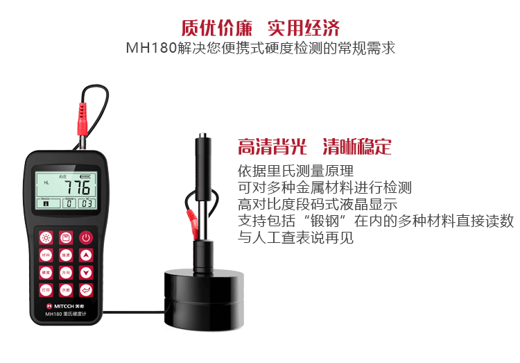產品概述MH180便攜式里氏硬度計基于里氏硬度測量原理,可方便快捷地現場檢測多種金屬材料的硬度,支持里氏、布氏、洛氏等多種硬度制氏間的自由轉換。它采用高對比度段碼式液晶顯示,體積小,重量輕,便于攜帶,性能穩定可靠。被廣泛地應用于金屬加工制造業、特種設備、永久性組件的失效分析、商檢等領域。可滿足工業生產硬度檢測的常規需求,質優價廉,是實用經濟款硬度計的首選。