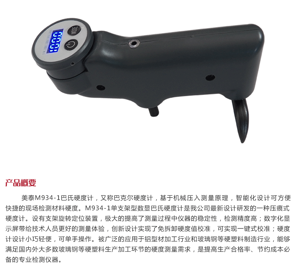 美泰M934-1巴氏硬度計,又稱巴克爾硬度計,基于機械壓入測量原理,智能化設計可方便快捷的現場檢測材料硬度。M934-1單支架型數顯巴氏硬度計是我公司最新設計研發的一種壓痕式硬度計。設有支架旋轉定位裝置,極大的提高了測量過程中儀器的穩定性,檢測精度高;數字化顯示屏帶給技術人員更好的測量體驗,創新設計實現了免拆卸硬度值校準,可實現一鍵式校準;硬度計設計小巧輕便,可單手操作。被廣泛的應用于鋁型材加工行業和玻璃鋼等硬塑料制造行業,能夠滿足國內外大多數玻璃鋼等硬塑料生產加工環節的硬度測量需求,是提高生產合格率、節約成本必備的專業檢測儀器。