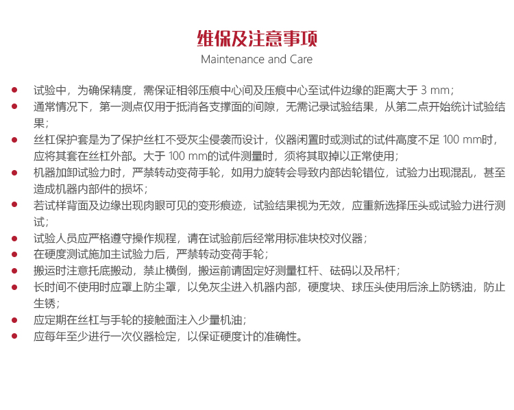 儀器的保養與維護?試驗中,為確保精度,需保證相鄰壓痕中心間及壓痕中心至試件邊緣的距離大于 3 mm;