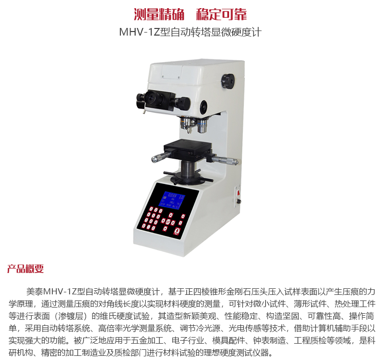 產(chǎn)品概述美泰MHV-1Z型自動轉塔顯微硬度計,基于正四棱錐形金剛石壓頭壓入試樣表面以產(chǎn)生壓痕的力學原理,通過測量壓痕的對角線長度以實現(xiàn)材料硬度的測量,可針對微小試件、薄形試件、熱處理工件等進行表面(滲鍍層)的維氏硬度試驗,其造型新穎美觀、性能穩(wěn)定、構造堅固、可靠性高、操作簡單,采用自動轉塔系統(tǒng)、高倍率光學測量系統(tǒng)、調節(jié)冷光源、光電傳感等技術,借助計算機輔助手段以實現(xiàn)強大的功能。被廣泛地應用于五金加工、電子行業(yè)、模具配件、鐘表制造、工程質檢等領域,是科研機構、精密的加工制造業(yè)及質檢部門進行材料試驗的理想硬度測試儀器。