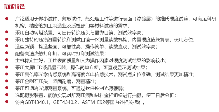 儀器特點廣泛適用于微小試件、薄形試件、熱處理工件等進行表面(滲鍍層)的維氏硬度試驗,可滿足科研機構,精密的加工制造業(yè)及質檢部門等材料試驗的需求;