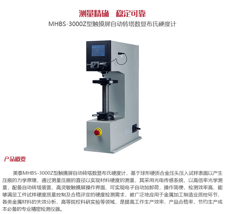 美泰MHBS-3000Z型觸摸屏自動轉(zhuǎn)塔數(shù)顯布氏硬度計,基于球形硬質(zhì)合金壓頭壓入試樣表面以產(chǎn)生壓痕的力學(xué)原理,通過測量壓痕的直徑以實現(xiàn)材料硬度的測量,其采用光電傳感系統(tǒng),以高倍率光學(xué)測量,配備自動轉(zhuǎn)塔裝置、高靈敏觸摸屏操作界面、可實現(xiàn)電子自動加卸荷,操作簡便,檢測效率高,能夠滿足工件試樣硬度質(zhì)量控制及合格評定的硬度檢測需求,被廣泛地應(yīng)用于金屬加工制造業(yè)質(zhì)控環(huán)節(jié)、各類金屬材料的失效分析、高等院校科研實驗等領(lǐng)域,是提高工作生產(chǎn)效率,產(chǎn)品合格率,節(jié)約生產(chǎn)成本必備的專業(yè)精密檢測儀器。