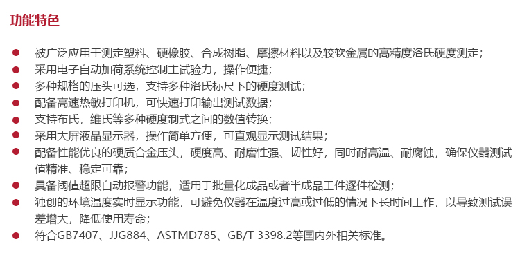 儀器特點?被廣泛應用于測定塑料、硬橡膠、合成樹脂、摩擦材料以及較軟金屬的高精度洛氏硬度測定;