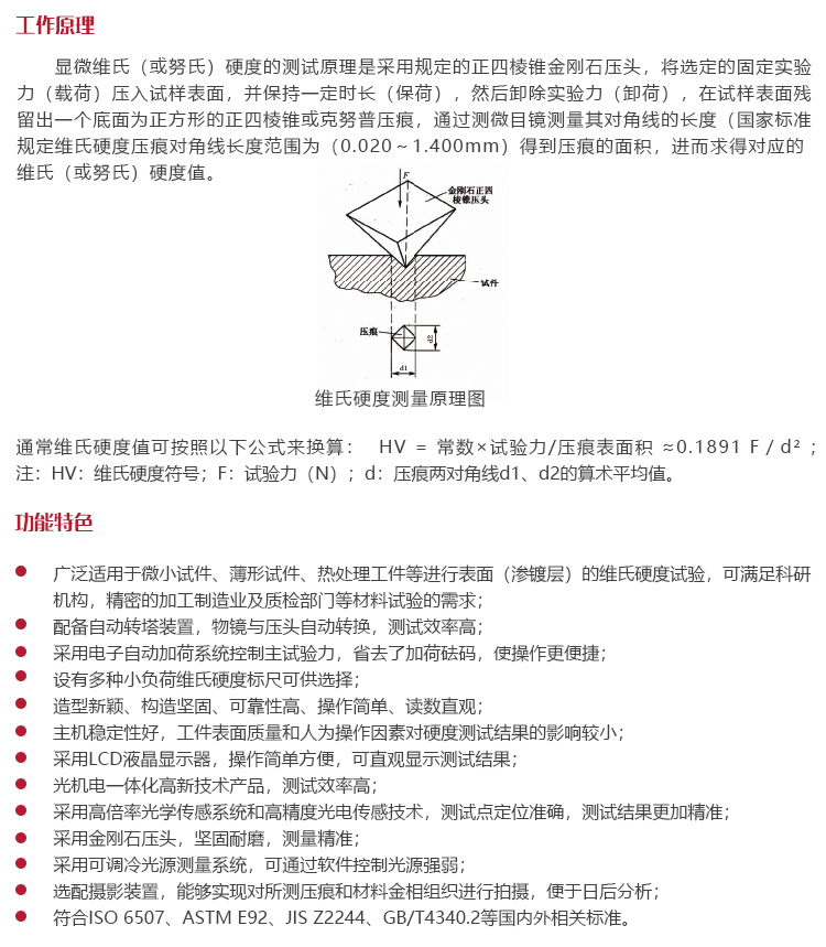 符合ISO 6507、ASTM E92、JIS Z2244、GB/T4340.2等國內外相關標準。