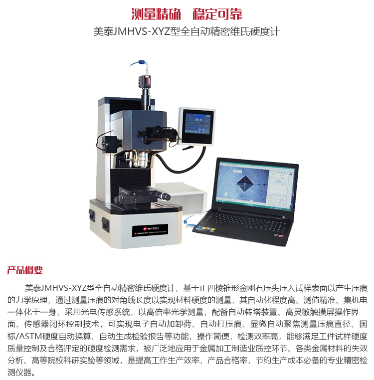 產品概述美泰JMHVS-XYZ型全自動精密維氏硬度計,基于正四棱錐形金剛石壓頭壓入試樣表面以產生壓痕的力學原理,通過測量壓痕的對角線長度以實現材料硬度的測量,其自動化程度高、測值精準、集機電一體化于一身,采用光電傳感系統,以高倍率光學測量,配備自動轉塔裝置、高靈敏觸摸屏操作界面、傳感器閉環控制技術、可實現電子自動加卸荷、自動打壓痕、顯微自動聚焦測量壓痕直徑、國標/ASTM硬度自動換算、自動生成檢驗報告等功能,操作簡便,檢測效率高,能夠滿足工件試樣硬度質量控制及合格評定的硬度檢測需求,被廣泛地應用于金屬加工制造業質控環節、各類金屬材料的失效分析、高等院校科研實驗等領域,是提高工作生產效率,產品合格率,節約生產成本必備的專業精密檢測儀器。