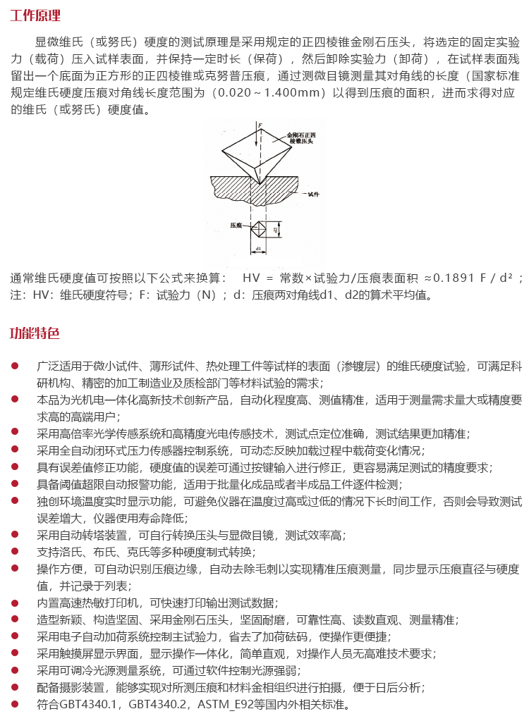 儀器特點廣泛適用于微小試件、薄形試件、熱處理工件等試樣的表面(滲鍍層)的維氏硬度試驗,可滿足科研機構、精密的加工制造業及質檢部門等材料研究和顯微硬度檢測的需求;