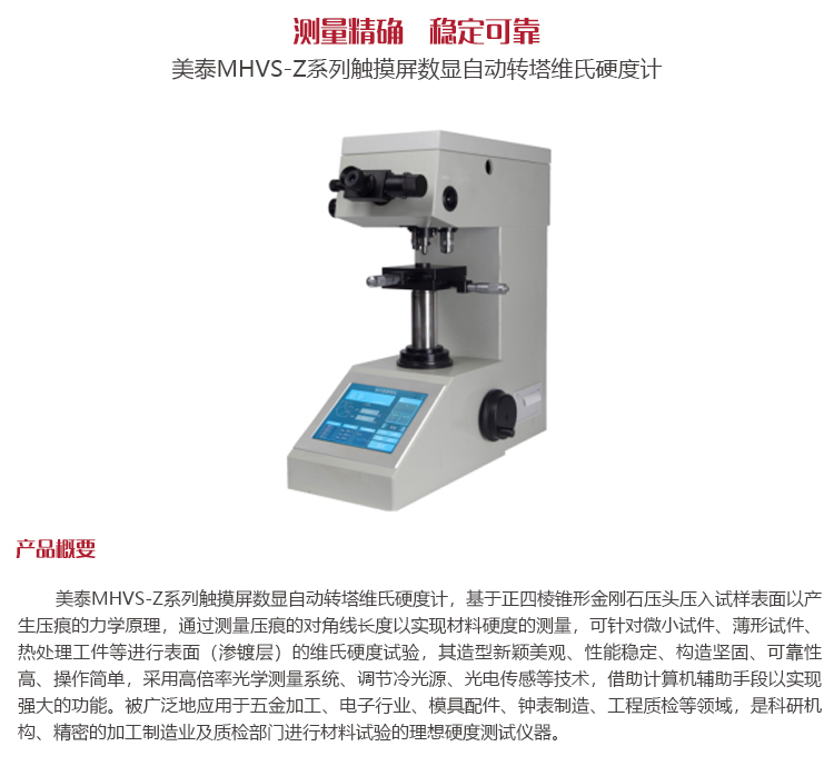 美泰MHVS-Z系列觸摸屏數顯自動轉塔維氏硬度計,基于正四棱錐形金剛石壓頭壓入試樣表面以產生壓痕的力學原理,通過測量壓痕的對角線長度以實現材料硬度的測量,可針對微小試件、薄形試件、熱處理工件等進行表面(滲鍍層)的維氏硬度試驗,其造型新穎美觀、性能穩定、構造堅固、可靠性高、操作簡單,采用高倍率光學測量系統、調節冷光源、光電傳感等技術,借助計算機輔助手段以實現強大的功能。被廣泛地應用于五金加工、電子行業、模具配件、鐘表制造、工程質檢等領域,是科研機構、精密的加工制造業及質檢部門進行材料試驗的理想硬度測試儀器。
