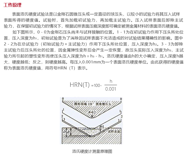 表面洛氏硬度試驗(yàn)法是以金剛石圓錐壓頭或一定直徑的球壓頭,以較小的試驗(yàn)力將其壓入試樣表面所得的硬度值。試驗(yàn)時(shí),首先加載初試驗(yàn)力,再加載主試驗(yàn)力。壓入試樣表面后卸除主試驗(yàn)力,在保留初試驗(yàn)力的情況下,根據(jù)試樣表面壓痕深度即可確定被測(cè)金屬材料的表面洛氏硬度值。