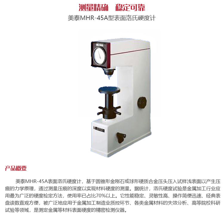 美泰MHR-45A表面洛氏硬度計(jì),基于圓錐形金剛石或球形硬質(zhì)合金壓頭壓入試樣淺表面以產(chǎn)生壓痕的力學(xué)原理,通過(guò)測(cè)量壓痕的深度以實(shí)現(xiàn)材料硬度的測(cè)量。據(jù)統(tǒng)計(jì),洛氏硬度試驗(yàn)是金屬加工行業(yè)應(yīng)用最為廣泛的硬度檢定方法,使用率已占比70%以上。它性能穩(wěn)定、靈敏性高、操作簡(jiǎn)便迅速、經(jīng)典表盤(pán)讀數(shù)直觀方便,被廣泛地應(yīng)用于金屬加工制造業(yè)質(zhì)控環(huán)節(jié)、各類金屬材料的失效分析、高等院校科研試驗(yàn)等領(lǐng)域,是測(cè)定金屬等材料表面硬度的精密檢測(cè)儀器。