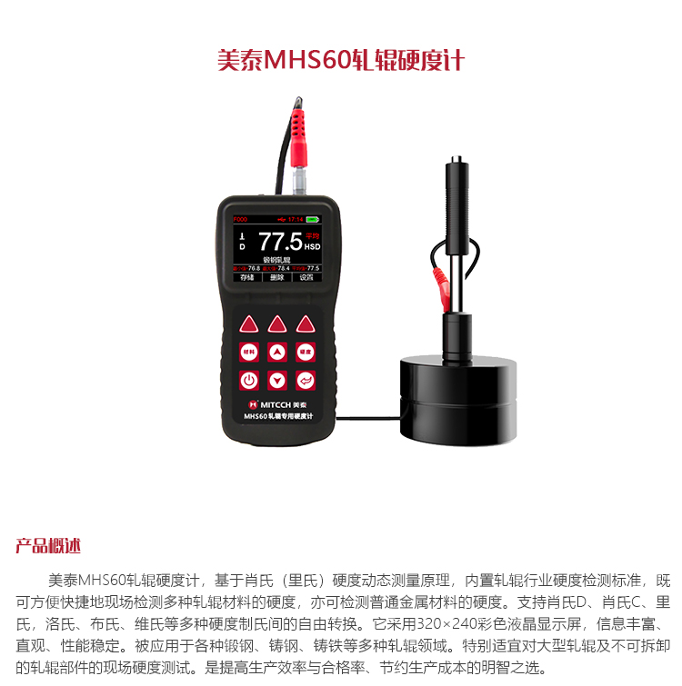 產(chǎn)品概述美泰MHS60軋輥硬度計(jì),基于肖氏(里氏)硬度動(dòng)態(tài)測(cè)量原理,內(nèi)置軋輥行業(yè)硬度檢測(cè)標(biāo)準(zhǔn),既可方便快捷地現(xiàn)場(chǎng)檢測(cè)多種軋輥材料的硬度,亦可檢測(cè)普通金屬材料的硬度。支持肖氏D、肖氏C、里氏,洛氏、布氏、維氏等多種硬度制氏間的自由轉(zhuǎn)換。它采用320×240彩色液晶顯示屏,信息豐富、直觀、性能穩(wěn)定。被應(yīng)用于各種鍛鋼、鑄鋼、鑄鐵等多種軋輥領(lǐng)域。特別適宜對(duì)大型軋輥及不可拆卸的軋輥部件的現(xiàn)場(chǎng)硬度測(cè)試。是提高生產(chǎn)效率與合格率、節(jié)約生產(chǎn)成本的明智之選。