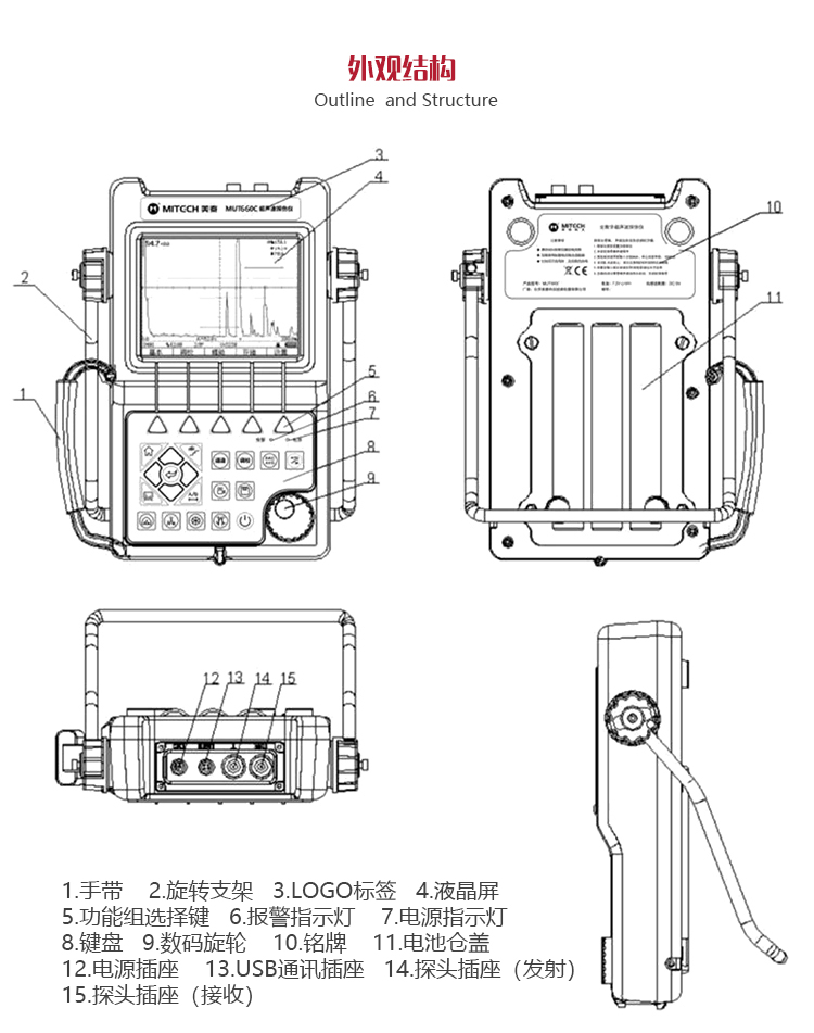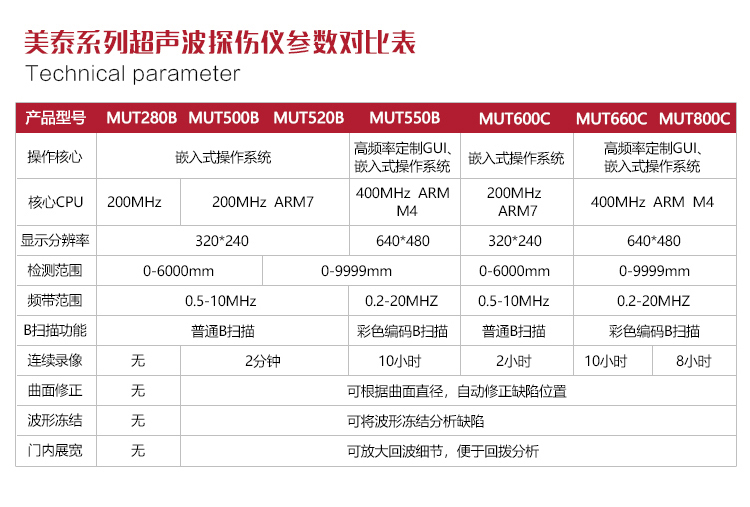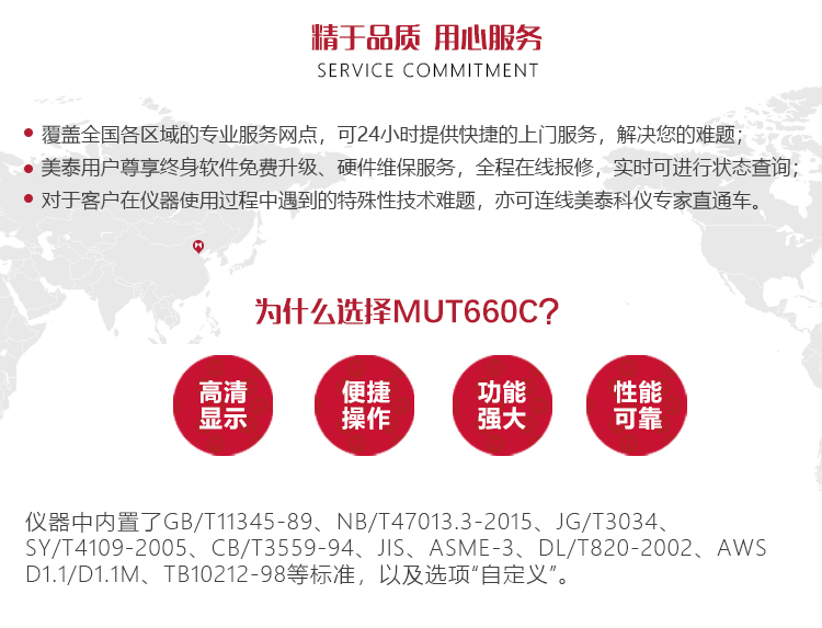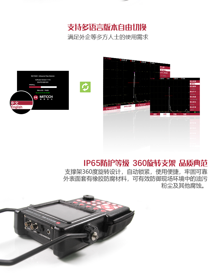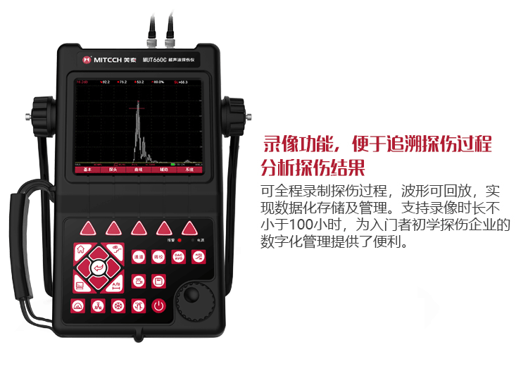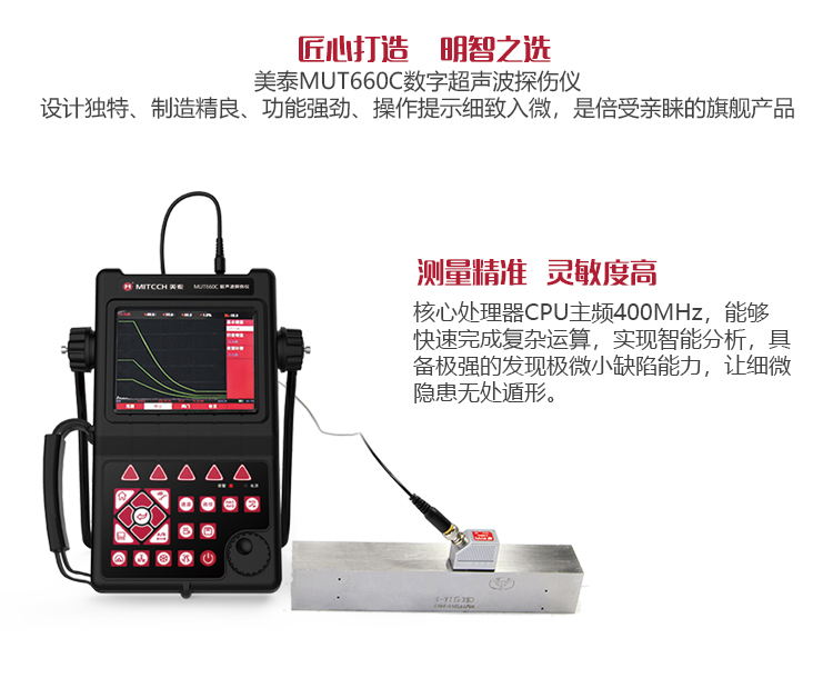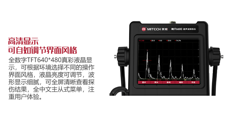 產品概述MUT660C智能數字式超聲波探傷儀是美泰公司專注多年精心研制的旗艦產品,其設計獨特、制造精良、操作便捷、功能強勁,集諸多優勢于一身,自問世以來一直倍受用戶親睞,它能夠快速便捷、無損傷、精確地進行工件內部多種缺陷(裂紋、夾雜、氣孔等)的檢測、定位、評估和診斷。采用全數字TFT 640×480真彩色液晶顯示屏,可根據環境選擇操作界面風格,液晶亮度可調節,界面設計人性化、波形顯示細膩;可全屏清晰發現缺陷;單手可把持操作,曲線制作、探頭校準等常規操作均可自動完成;核心處理器CPU主頻400M,能快速完成復雜運算,實現智能缺陷分析;低功耗設計配備大容量高性能鋰離子電池模塊可連續工作10小時以上;全中文主從式菜單,注重用戶體驗,集快捷按鍵、數碼飛梭旋輪、十字菜單三種操作方式于一體,不同使用習慣均可操作自如;支持多語言。防水、防油、防塵可達到IP65防護等級。是石油、化工、冶金、造船、航空、鐵路等領域缺陷檢測、質量控制、在役安全監測與壽命評估必備的專業精密儀器。