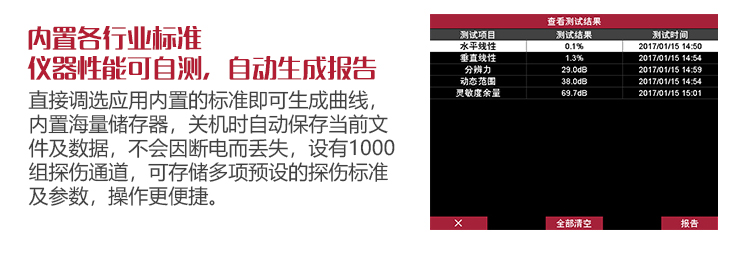 | 探傷標準 | 內置各行業常用探傷標準,直接調用,方便、快捷 |