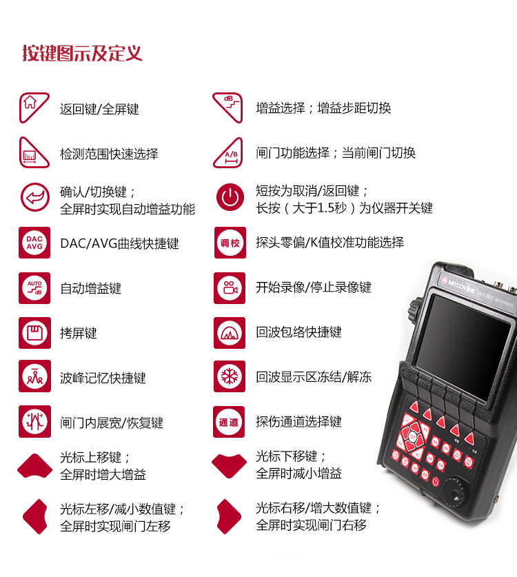 | 自動校準 | 探頭零點和探頭角度(K值)自動校準功能;聲速自動測量功能 |