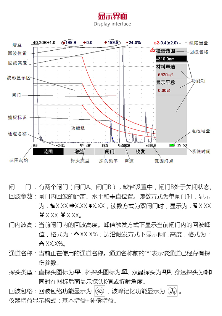 | 回波編碼 | 以不同顏色顯示1~6次回波顯示區,便于判斷缺陷位置 |