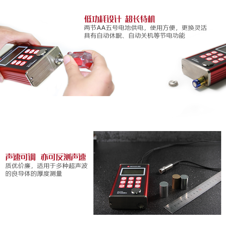 | 美泰系列超聲波測厚儀,均采用低功耗設計理念,超長待機,MT150/MT160/MT200/MT180/MT192/MT280/MT600/MT660均由兩節AA五號電池供電、更換方便。 | |