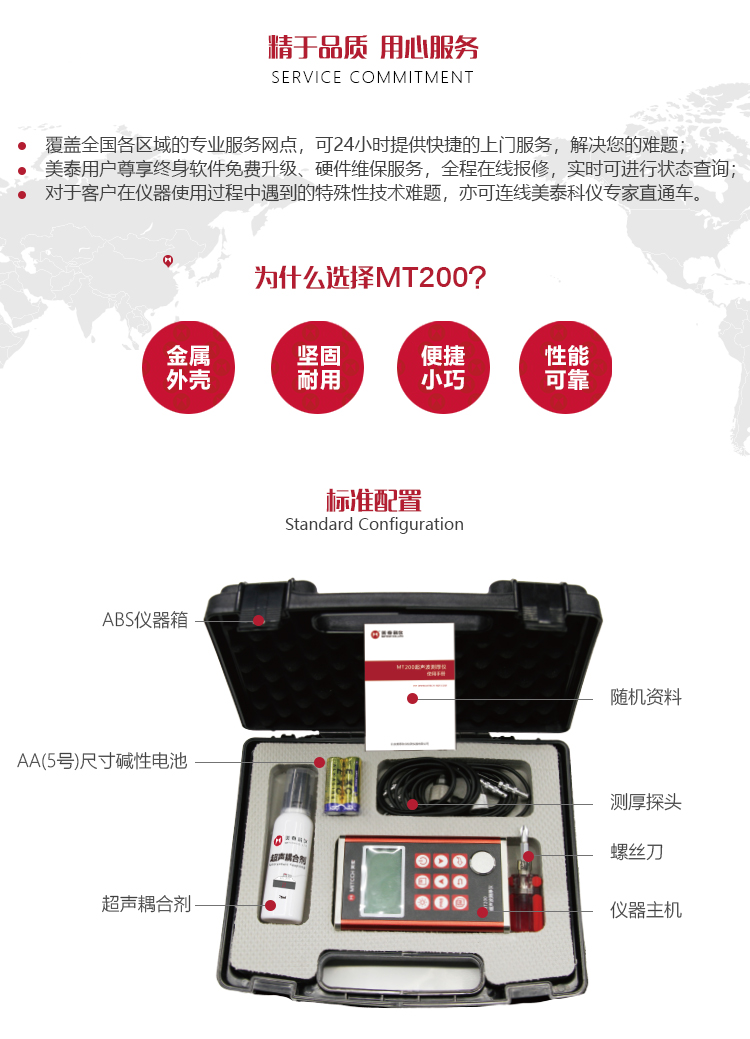 MT200超聲波測厚儀,基于超聲傳播原理,可對金屬、塑料、陶瓷、玻璃及其他多種超聲波的良導體材料進行厚度測量,也可實現對材料聲速的反測。密封的金屬外殼精巧設計,可防御惡劣現場環境中的油污、粉塵;與傳統的測量方法相比,超聲波測厚儀的優勢在于它只要接觸到被測工件的一面即可完成測量,其獨特的無損檢測性能為封閉類管材、容器等厚度檢測受局限的工況提供了完美的解決方案,被廣泛應用于石油、化工、冶金、造船、航空、航天等領域的生產設備中各種管道及壓力容器腐蝕減薄程度的監測,也可用于對各種板材及各種加工零件做精確的測量。