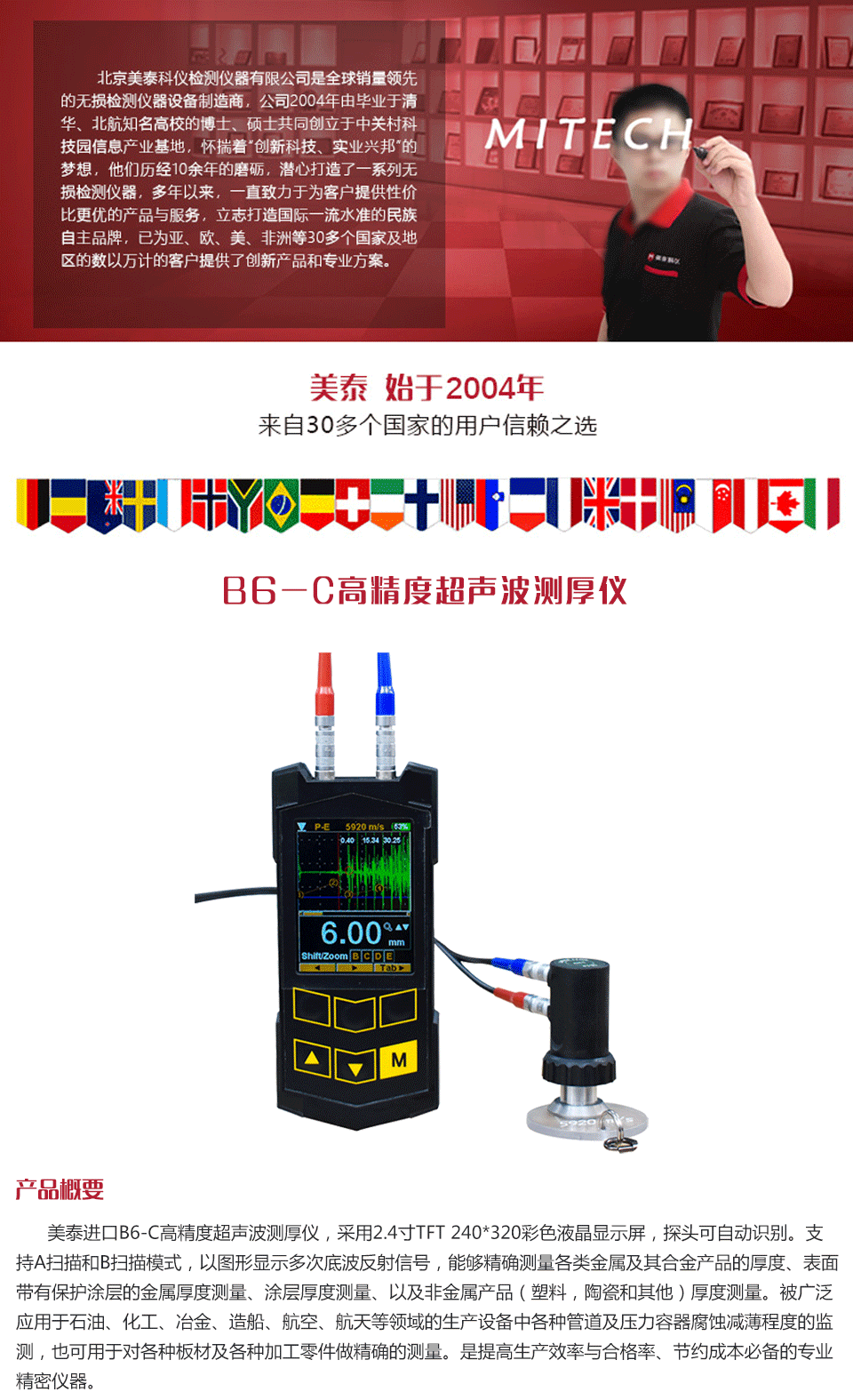 美泰進口B6-C高精度超聲波測厚儀,采用2.4寸TFT 240*320彩色液晶顯示屏,探頭可自動識別。支持A掃描和B掃描模式,以圖形顯示多次底波反射信號,能夠精確測量各類金屬及其合金產品的厚度、表面帶有保護涂層的金屬厚度測量、涂層厚度測量、以及非金屬產品(塑料,陶瓷和其他)厚度測量。被廣泛應用于石油、化工、冶金、造船、航空、航天等領域的生產設備中各種管道及壓力容器腐蝕減薄程度的監測,也可用于對各種板材及各種加工零件做精確的測量。是提高生產效率與合格率、節約成本必備的專業精密儀器。