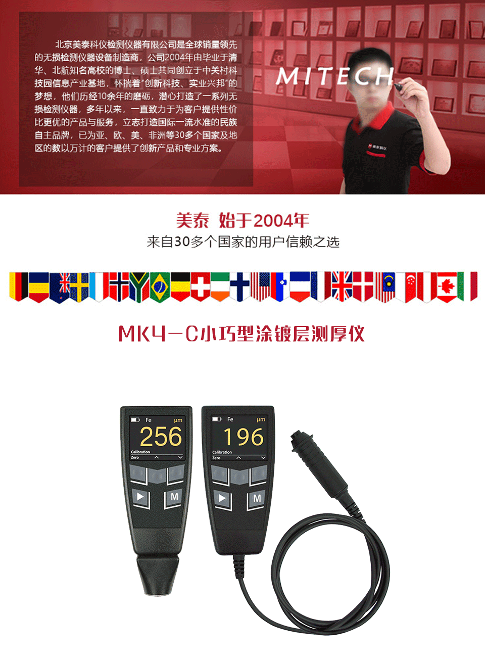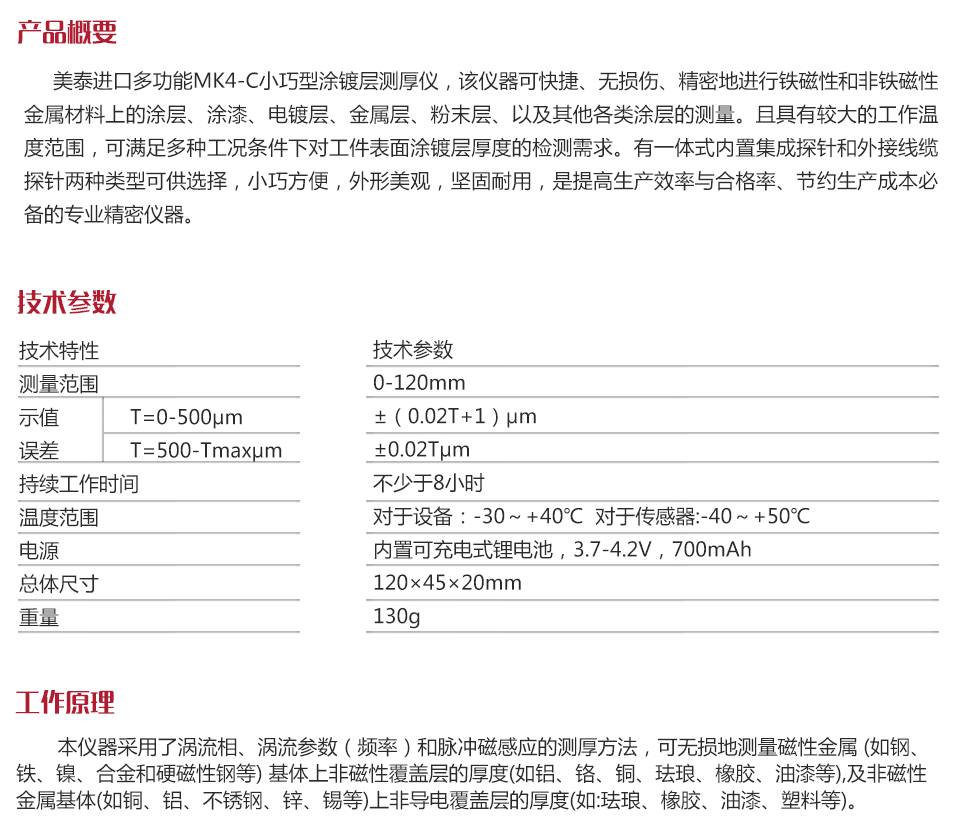 美泰進口多功能MK4-C小巧型涂鍍層測厚儀,該儀器可快捷、無損傷、精密地進行鐵磁性和非鐵磁性金屬材料上的涂層、涂漆、電鍍層、金屬層、粉末層、以及其他各類涂層的測量。且具有較大的工作溫度范圍,可滿足多種工況條件下對工件表面涂鍍層厚度的檢測需求。有一體式內置集成探針和外接線纜探針兩種類型可供選擇,小巧方便,外形美觀,堅固耐用,是提高生產效率與合格率、節約生產成本必備的專業精密儀器。