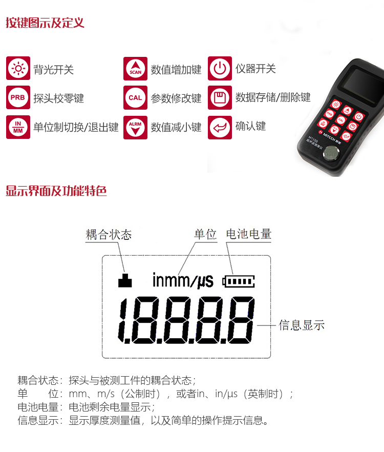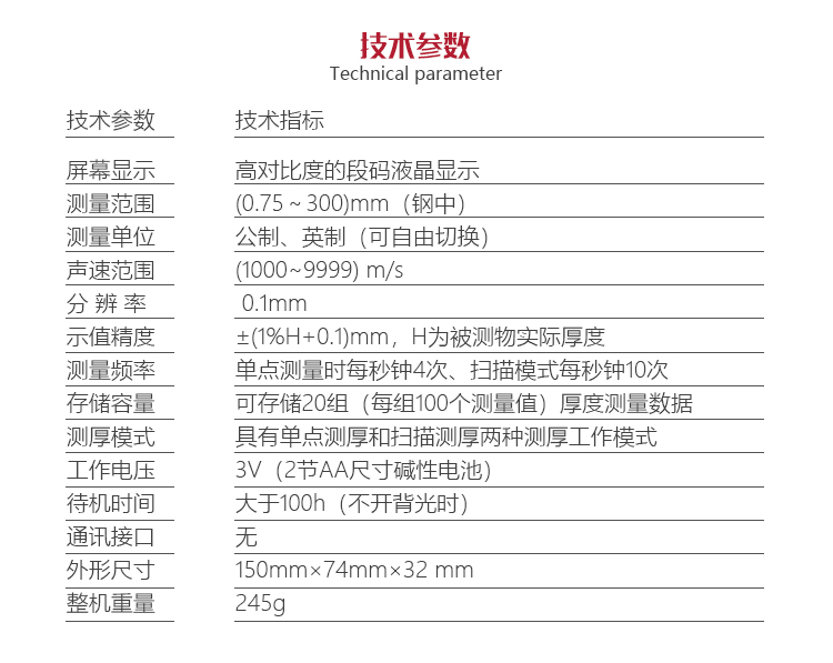 | 測量范圍 | (0.75~300)mm(鋼中),公制與英制可自由轉(zhuǎn)換 |