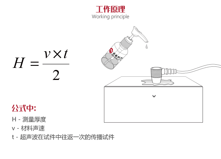 工作原理本超聲波測厚儀對厚度的測量,是由探頭產(chǎn)生超聲波脈沖透過耦合劑到達(dá)被測體,一部分超聲信號被物體底面反射,探頭接收由被測體底面反射的回波,精確地計算超聲波的往返時間,并按下式計算厚度值,再將計算結(jié)果顯示出來。
