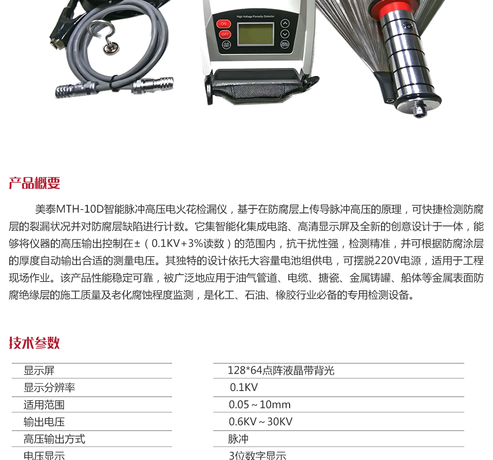 產品概述MTH-10D型數字式直流電火花檢漏儀,基于將脈沖高壓傳導通過防腐層的原理,可快捷檢測防腐層的裂漏狀況,使用中,針對防腐層的質量問題,如遇針孔、氣泡、裂紋,儀器會發出明亮的電火花,同時伴有警示音,操作極為簡便,其獨特的設計依托大容量電池組供電,可擺脫220V電源,適用于工程現場作業。該產品性能穩定可靠,被廣泛地應用于油氣管道、電纜、搪瓷、金屬鑄罐、船體等金屬表面防腐絕緣層的施工質量及老化腐蝕程度監測,是化工、石油、橡膠行業必備的專用檢測設備。