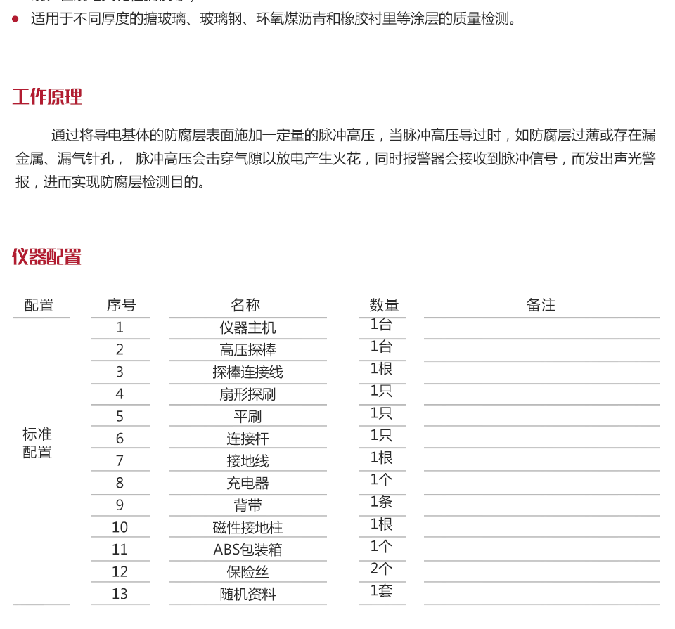 功能用途?適用于不同厚度的搪玻璃、玻璃鋼、環氧煤瀝青和橡膠襯里等涂層的質量檢測。