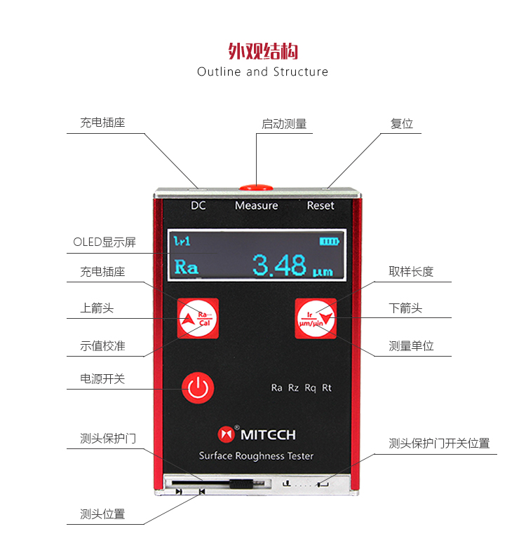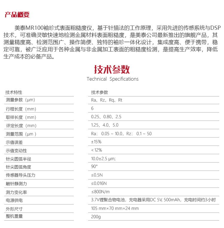 美泰MR100袖珍式表面粗糙度儀,基于針描法的工作原理,采用先進的傳感系統與DSP技術,可準確靈敏快速地檢測金屬材料表面粗糙度,是美泰公司為檢測粗糙度研發的最新袖珍產品,其具有測量精度高、測量范圍廣、操作簡便、便于攜帶、工作穩定等特點,被廣泛應用于各種金屬與非金屬加工表面的檢測,是提高生產效率,降低生產成本的必備產品。