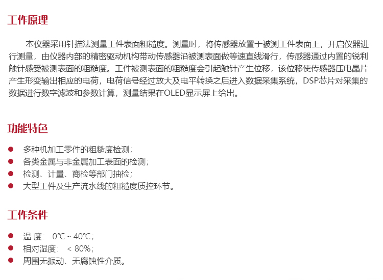 本儀器在測量工件表面粗糙度時,先將傳感器放置在工件被測表面上,然后啟動儀器進行測量,由儀器內部的精密驅動機構帶動傳感器沿被測表面做勻速直線滑行,傳感器通過內置的銳利觸針感受被測表面的粗糙度,此時工件被測表面的粗糙度會引起觸針產生上下位移,該位移使傳感器壓電晶片產生形變輸出相應的電荷,該信號經過放大及電平轉換之后進入數據采集系統,DSP芯片對采集的數據進行數字濾波和參數計算,測量結果在OLED顯示屏上給出。