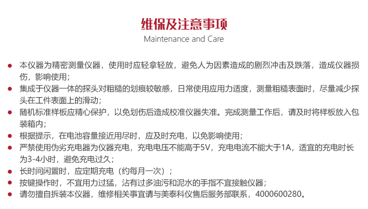 美泰便攜式粗糙度儀MR100屬精密檢測儀器,使用中應特別注意如下事項: