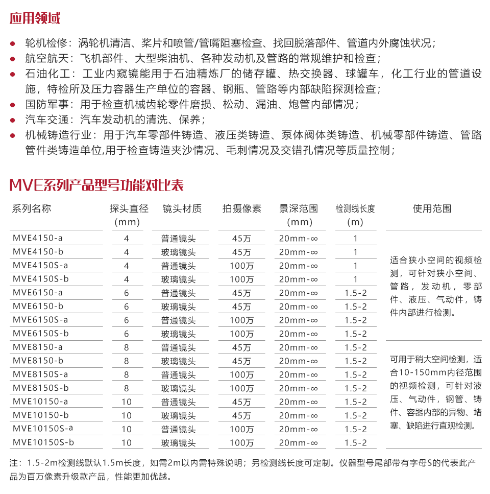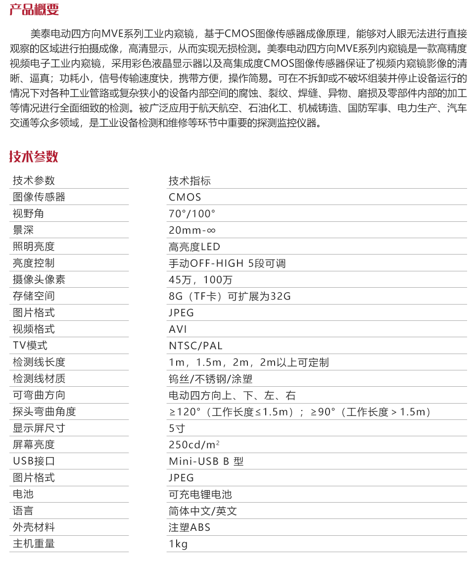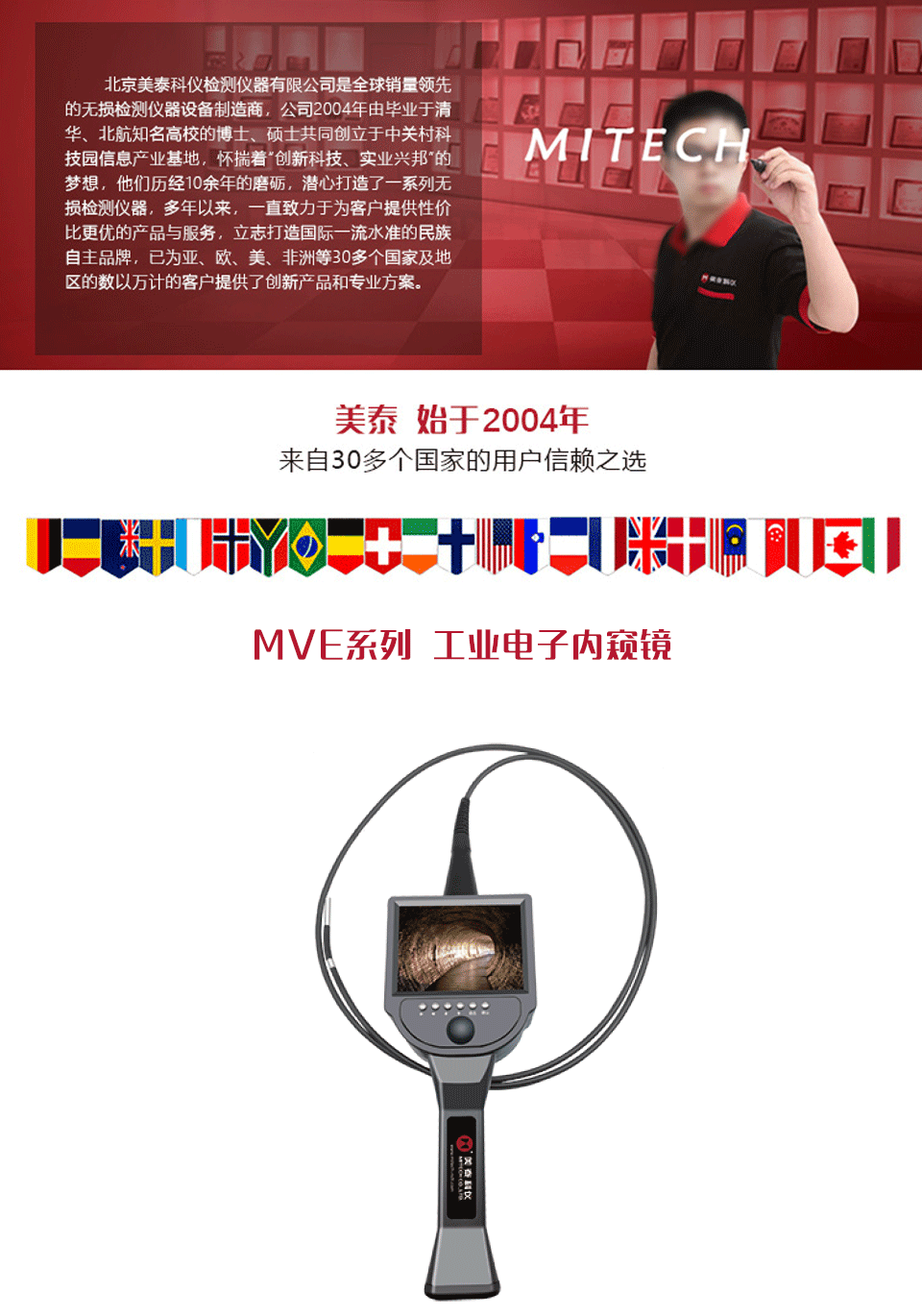 美泰電動四方向MVE系列工業內窺鏡,基于CMOS圖像傳感器成像原理,能夠對人眼無法進行直接觀察的區域進行拍攝成像,高清顯示,從而實現無損檢測。美泰電動四方向MVE系列內窺鏡是一款高精度視頻電子工業內窺鏡,采用彩色液晶顯示器以及高集成度CMOS圖像傳感器保證了視頻內窺鏡影像的清晰、逼真;功耗小,信號傳輸速度快,攜帶方便,操作簡易。可在不拆卸或不破壞組裝并停止設備運行的情況下對各種工業管路或復雜狹小的設備內部空間的腐蝕、裂紋、焊縫、異物、磨損及零部件內部的加工等情況進行全面細致的檢測。被廣泛應用于航天航空、石油化工、機械鑄造、國防軍事、電力生產、汽車交通等眾多領域,是工業設備檢測和維修等環節中重要的探測監控儀器。