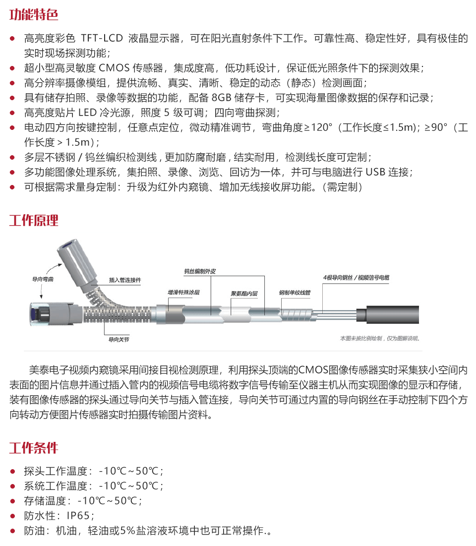 工作原理美泰電子視頻內窺鏡采用間接目視檢測原理,利用探頭頂端的CMOS圖像傳感器實時采集狹小空間內表面的圖片信息并通過插入管內的視頻信號電纜將數字信號傳輸至儀器主機從而實現圖像的顯示和存儲,裝有圖像傳感器的探頭通過導向關節與插入管連接,導向關節可通過內置的導向鋼絲在微型電機控制下四個方向轉動方便圖片傳感器實時拍攝傳輸圖片資料。