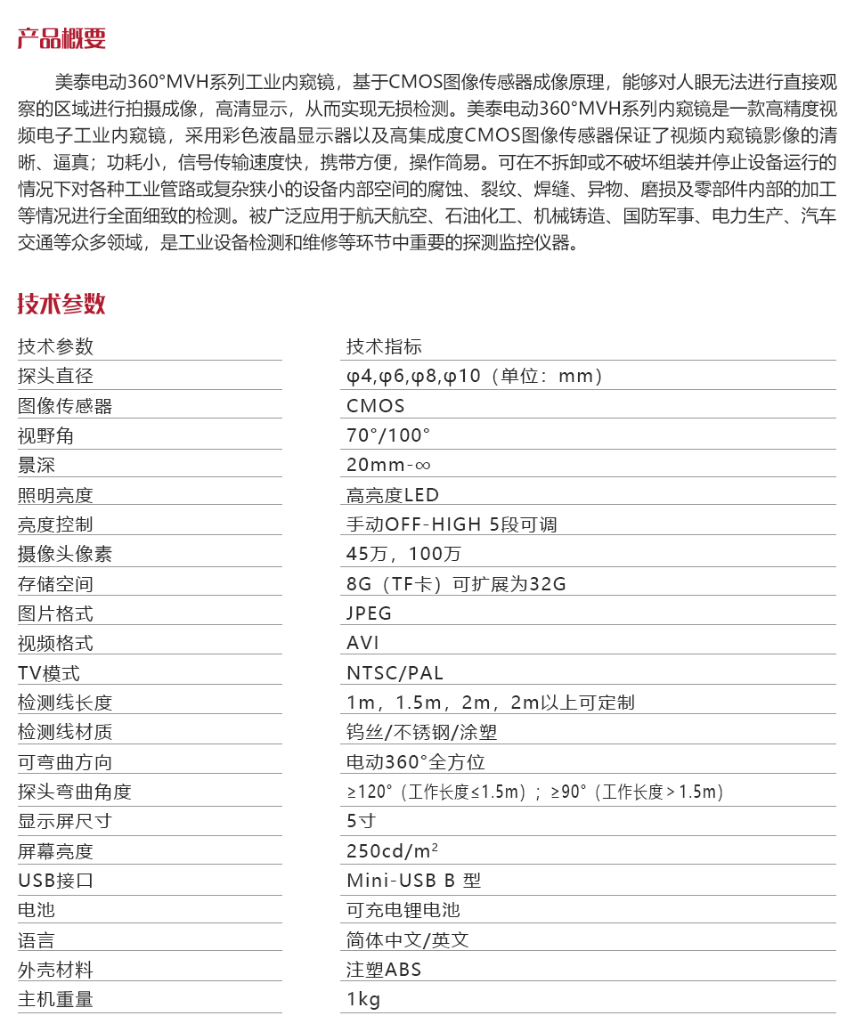 美泰電動360°MVH系列工業內窺鏡,基于CMOS圖像傳感器成像原理,能夠對人眼無法進行直接觀察的區域進行拍攝成像,高清顯示,從而實現無損檢測。美泰電動360°MVH系列內窺鏡是一款高精度視頻電子工業內窺鏡,采用彩色液晶顯示器以及高集成度CMOS圖像傳感器保證了視頻內窺鏡影像的清晰、逼真;功耗小,信號傳輸速度快,攜帶方便,操作簡易。可在不拆卸或不破壞組裝并停止設備運行的情況下對各種工業管路或復雜狹小的設備內部空間的腐蝕、裂紋、焊縫、異物、磨損及零部件內部的加工等情況進行全面細致的檢測。被廣泛應用于航天航空、石油化工、機械鑄造、國防軍事、電力生產、汽車交通等眾多領域,是工業設備檢測和維修等環節中重要的探測監控儀器。