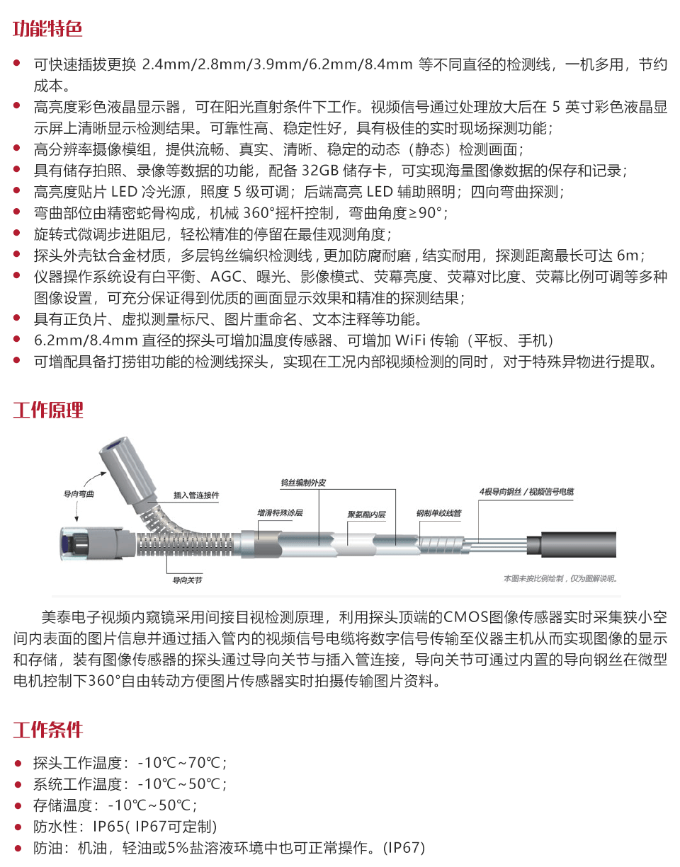 工作原理美泰電子視頻內窺鏡采用間接目視檢測原理,利用探頭頂端的CMOS圖像傳感器實時采集狹小空間內表面的圖片信息并通過插入管內的視頻信號電纜將數字信號傳輸至儀器主機從而實現圖像的顯示和存儲,裝有圖像傳感器的探頭通過導向關節與插入管連接,導向關節可通過內置的導向鋼絲在微型電機控制下360°自由轉動方便圖片傳感器實時拍攝傳輸圖片資料。