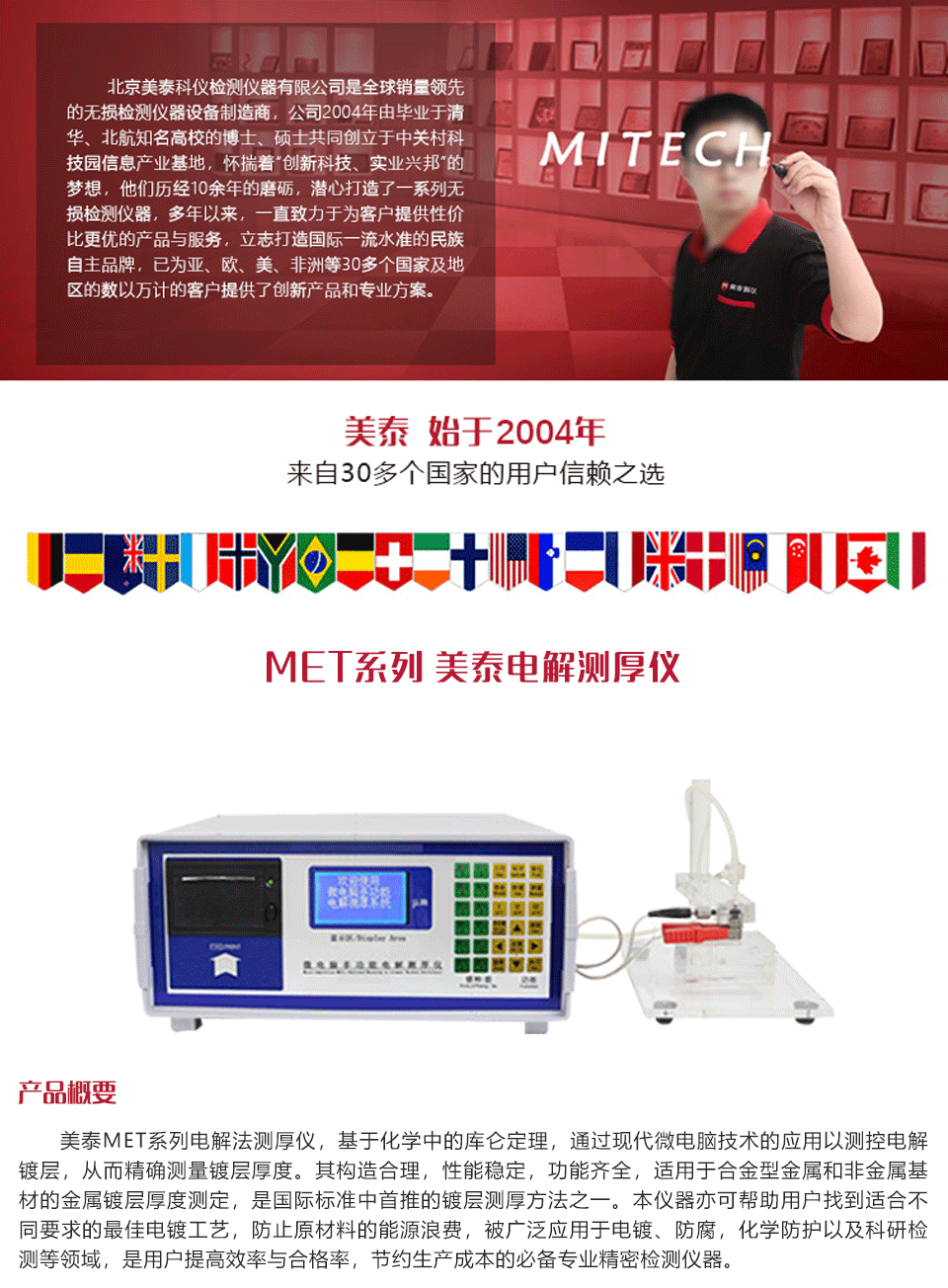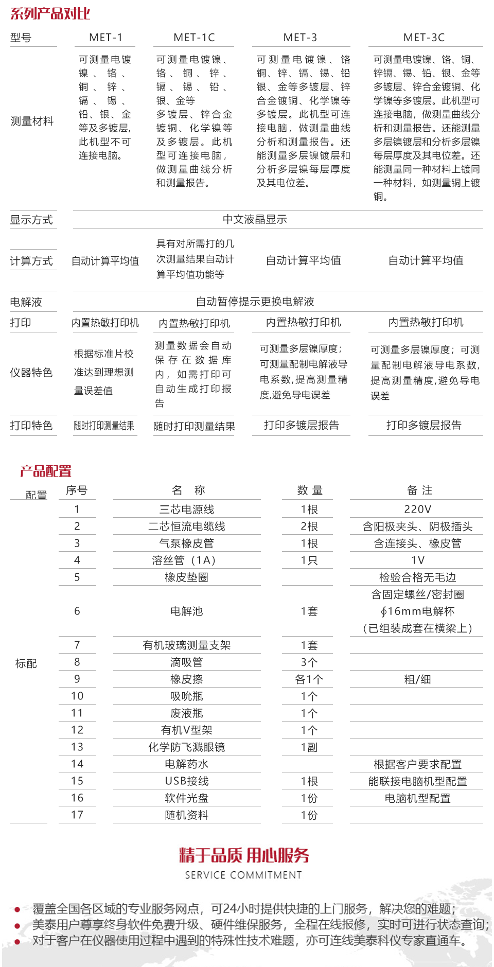 美泰MET系列電解法測厚儀,基于化學中的庫侖定理,通過現代微電腦技術的應用以測控電解鍍層,從而精確測量鍍層厚度。其構造合理,性能穩定,功能齊全,適用于合金型金屬和非金屬基材的金屬鍍層厚度測定,是國際標準中首推的鍍層測厚方法之一。本儀器亦可幫助用戶找到適合不同要求的最佳電鍍工藝,防止原材料的能源浪費,被廣泛應用于電鍍、防腐,化學防護以及科研檢測等領域,是用戶提高效率與合格率,節約生產成本的必備專業精密檢測儀器。