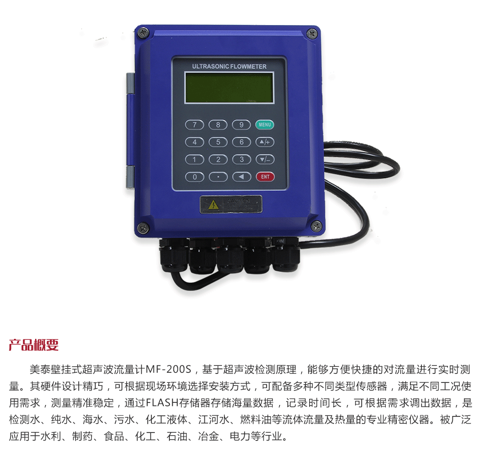 產品概述美泰壁掛式超聲波流量計MF-200S,基于超聲波檢測原理,能夠方便快捷的對流量進行實時測量。其硬件設計精巧,可根據現場環境選擇安裝方式,可配備多種不同類型傳感器,滿足不同工況使用需求,測量精準穩定,通過FLASH存儲器存儲海量數據,記錄時間長,可根據需求調出數據,是檢測水、純水、海水、污水、化工液體、江河水、燃料油等流體流量及熱量的專業精密儀器。被廣泛應用于水利、制藥、食品、化工、石油、冶金、電力等行業。