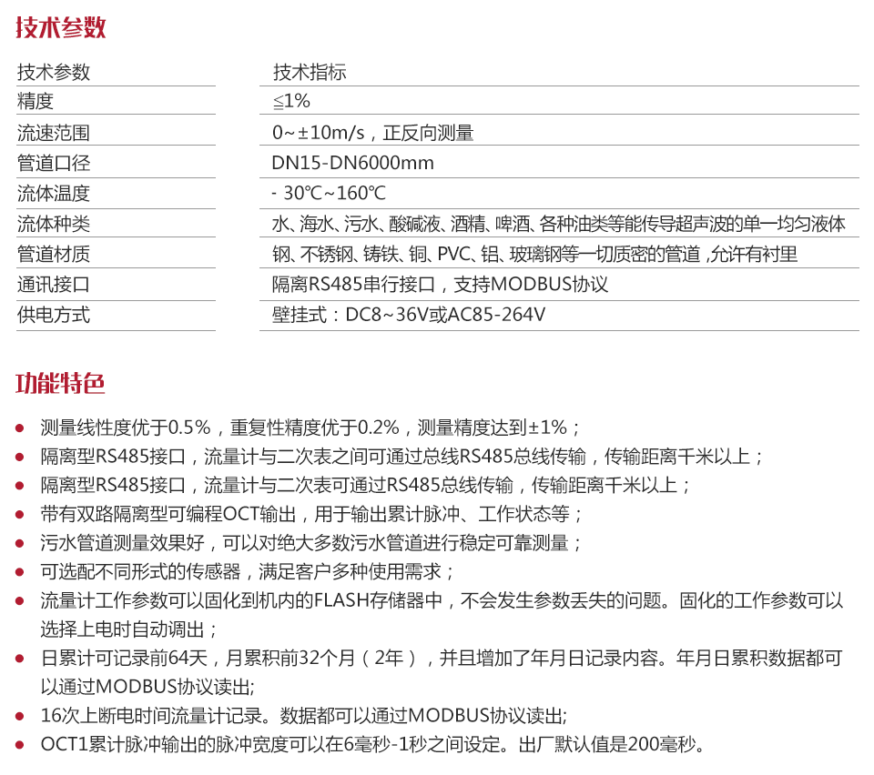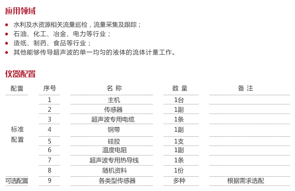 | 流體種類 | 水、海水、污水、酸堿液、酒精、啤酒、各種油類等能傳導超聲波的單一均勻液體 |