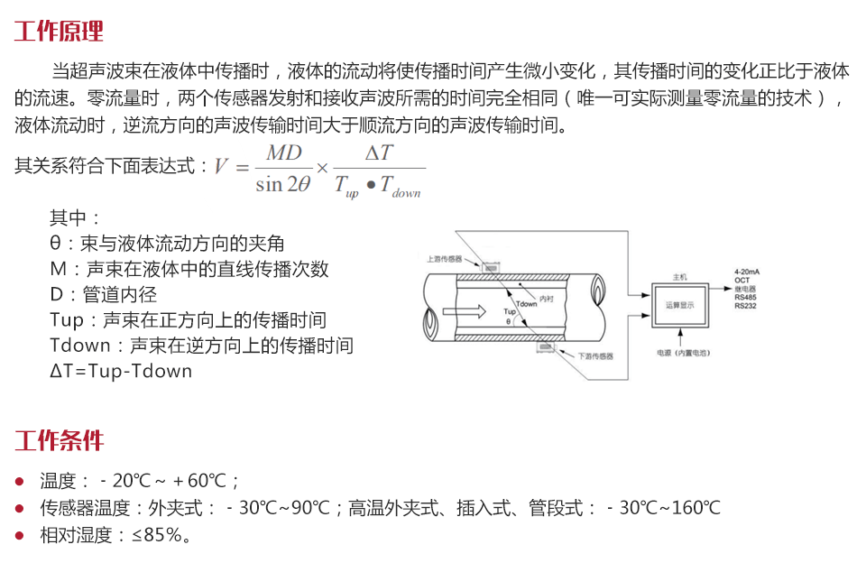 工作原理當超聲波束在液體中傳播時,液體的流動將使傳播時間產生微小變化,其傳播時間的變化正比于液體的流速。零流量時,兩個傳感器發射和接收聲波所需的時間完全相同(唯一可實際測量零流量的技術),液體流動時,逆流方向的聲波傳輸時間大于順流方向的聲波傳輸時間。
