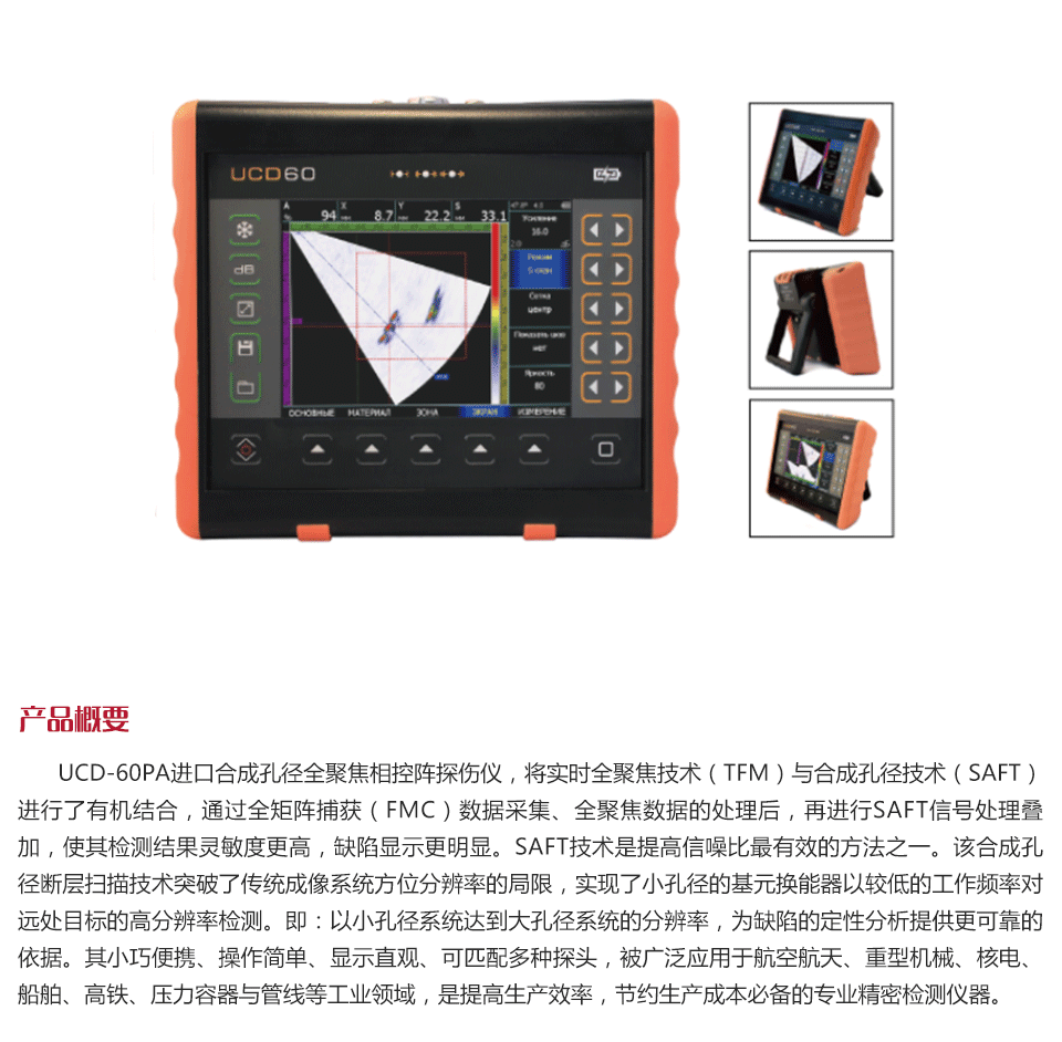 產品概述進口UCD-60合成孔徑全聚焦相控陣檢測儀,實現全聚焦技術(TFM)與合成孔徑技術(SAFT)有機結合,合成孔徑斷層掃描技術方法突破了傳統成像系統方位分辨率的概念,實現了以小孔徑系統達到大孔徑系統的分辨率,檢測結果靈敏度更高,缺陷顯示更加明顯,為缺陷的定性分析提供更可靠的依據。其小巧便攜、操作簡單、顯示直觀、可匹配多種傳感器,廣泛應用于航空航天、重型機械、核電、船舶、高鐵、壓力容器與管線等工業領域,是提高生產效率,節約生產成本必備的專業精密檢測儀器。